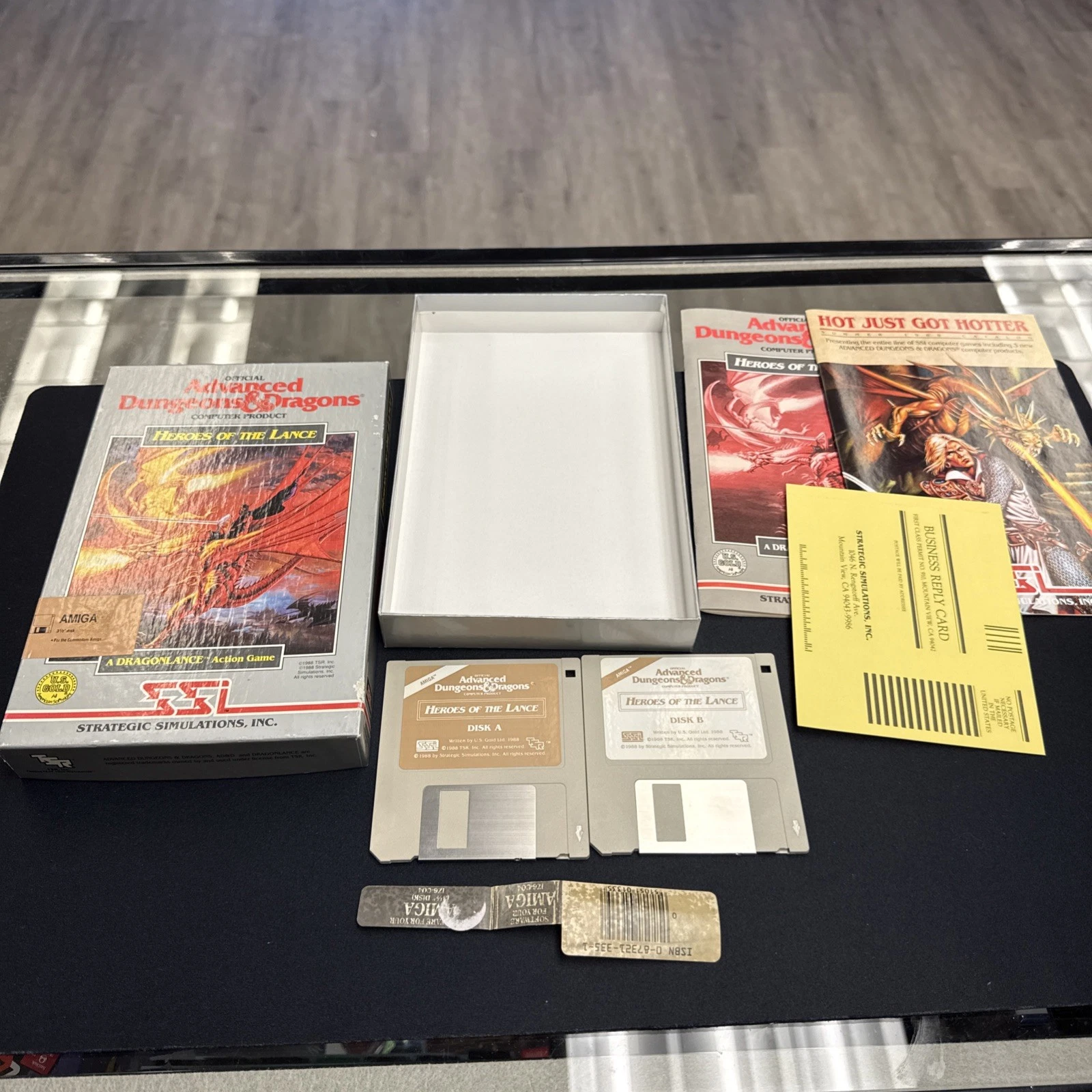 En la segunda imagen de este ejemplar Silverbox de Heroes of the Lance para AMIGA, la que muestra los contenidos de la caja, hay un elemento que claramente está fuera de lugar.